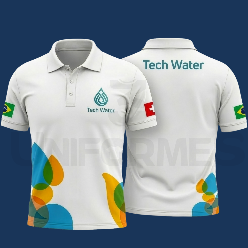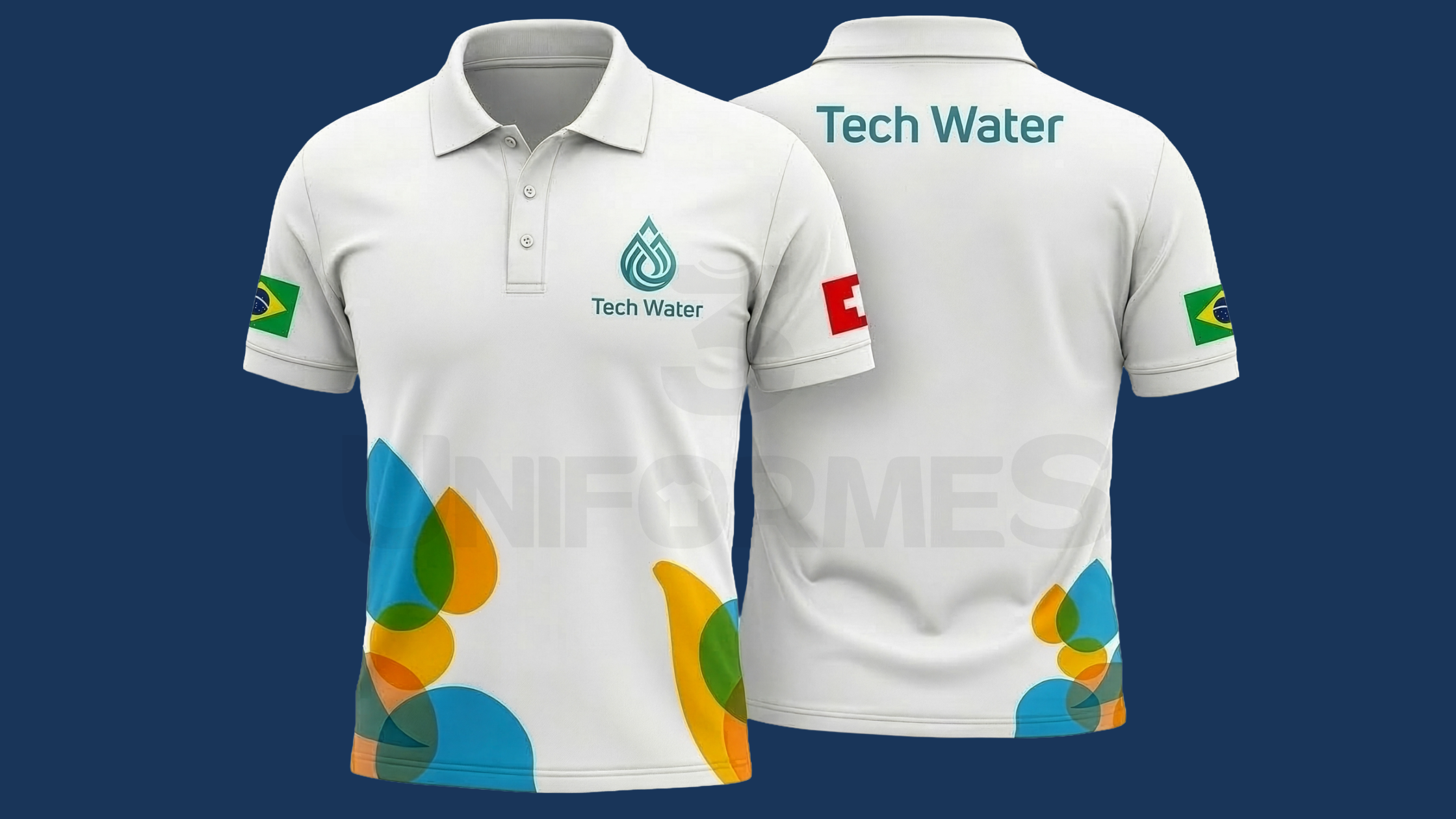 Na frente, havia uma composição de gotas na parte inferior, mais o logo da empresa no peito. Nas costas, as mesmas formas apareciam em tamanho maior, ocupando boa parte da área. No modelo polo, o padrão se repetia adaptado ao modelo.